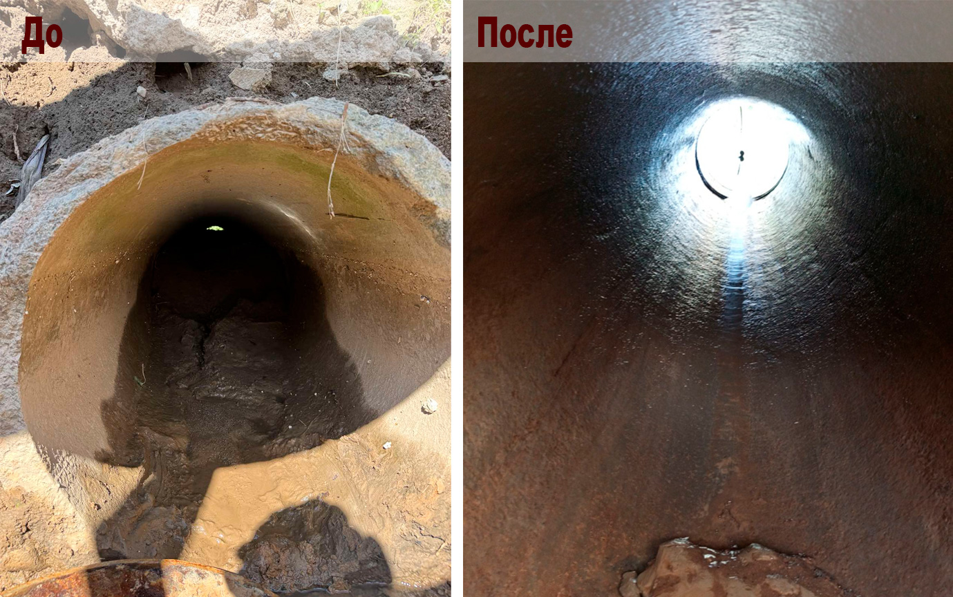 - Пропускная способность канализации после прочистки устанавливается практически на уровне первого запуска в эксплуатацию.