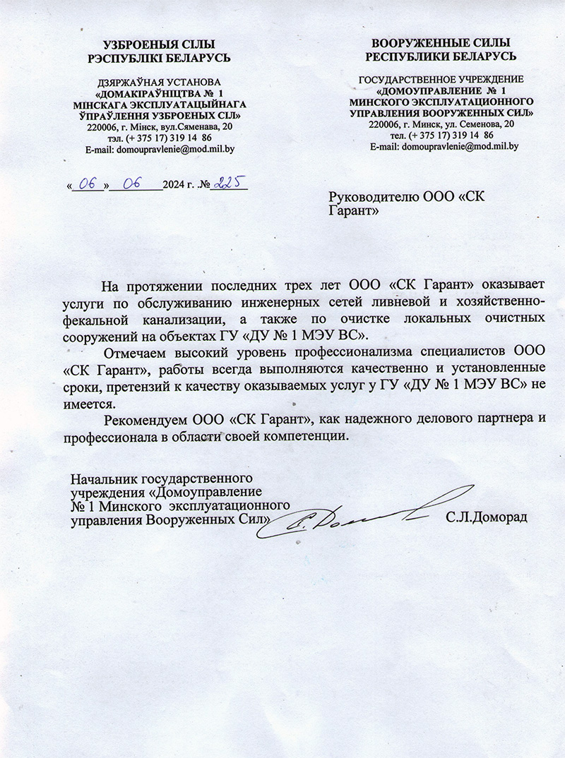 На протяжении последних трех лет ООО «СК Гарант» оказывает услуги по обслуживанию инженерных сетей ливневой и хозяйственно-фекальной канализации, а также по очистке локальных очистных сооружений на объектах ГУ «ДУ № 1 МЭУ ВС». Отмечаем высокий уровень профессионализма специалистов ООО «СК Гарант», работы всегда выполняются качественно и установленные сроки, претензий к качеству оказываемых услуг у ГУ «ДУ № 1 МЭУ ВС» не имеется. О Рекомендуем ООО «СК Гарант», как надежного делового партнера и профессионала в области своей компетенции.