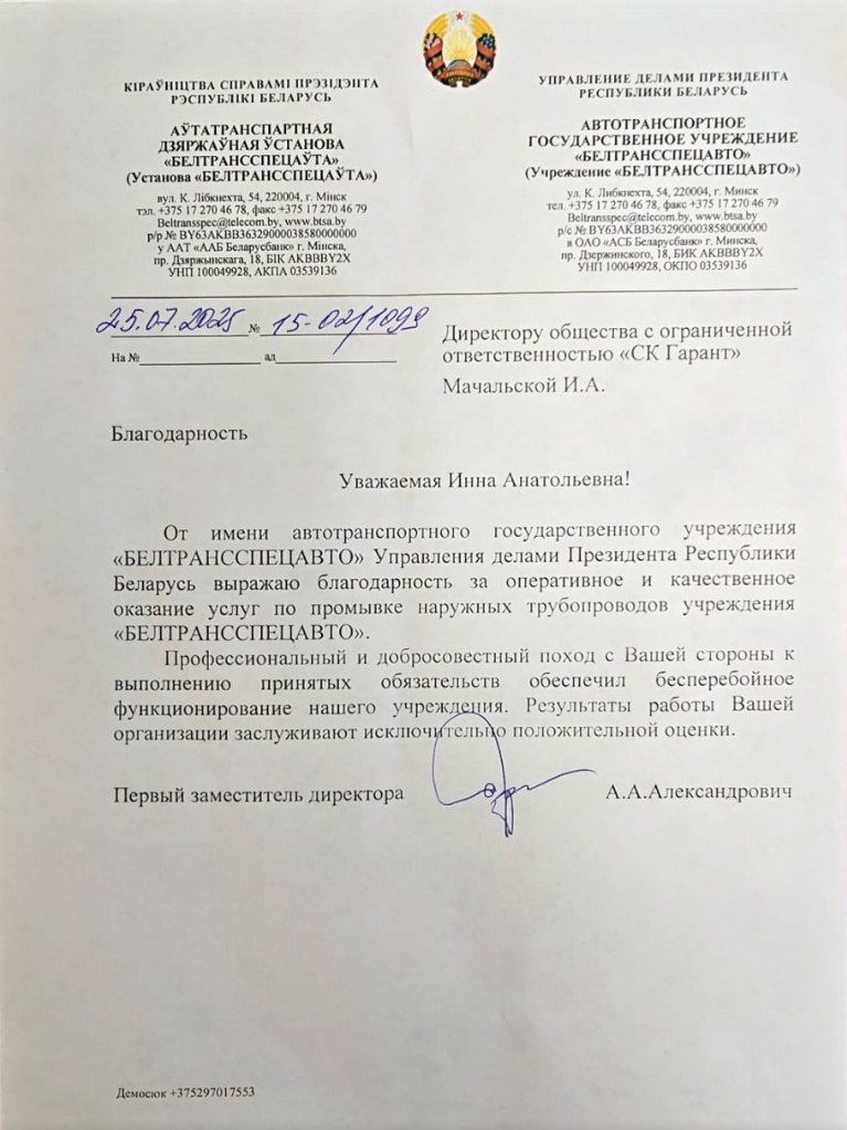 От имени автотранспортного государственного агентства «БЕЛТРАНССПЕЦАВТО» Управления делами Президента Республики Беларусь выражаю благодарность за оперативное и качественное оказание услуг по промывке наружных трубопроводов учреждения «БЕЛТРАНССПЕЦАВТО».